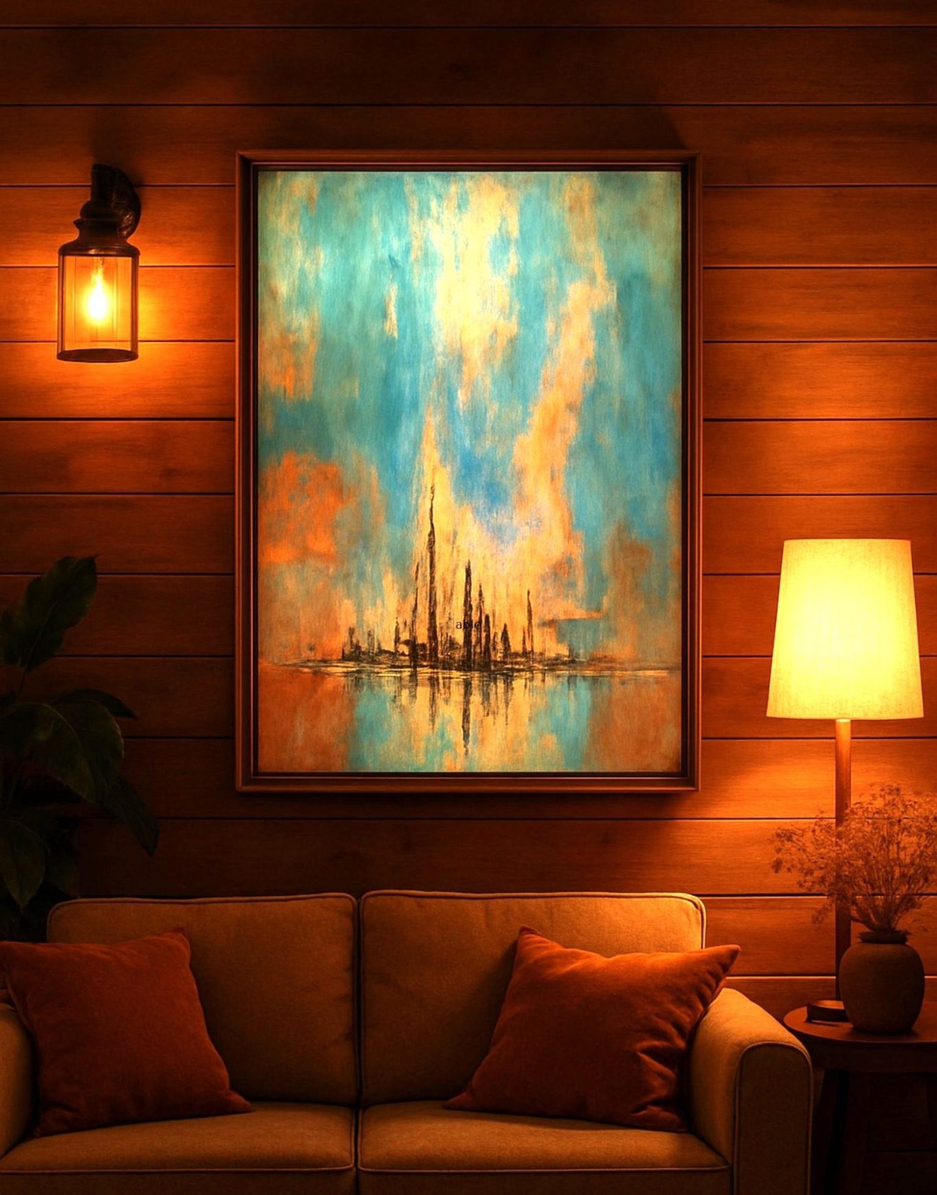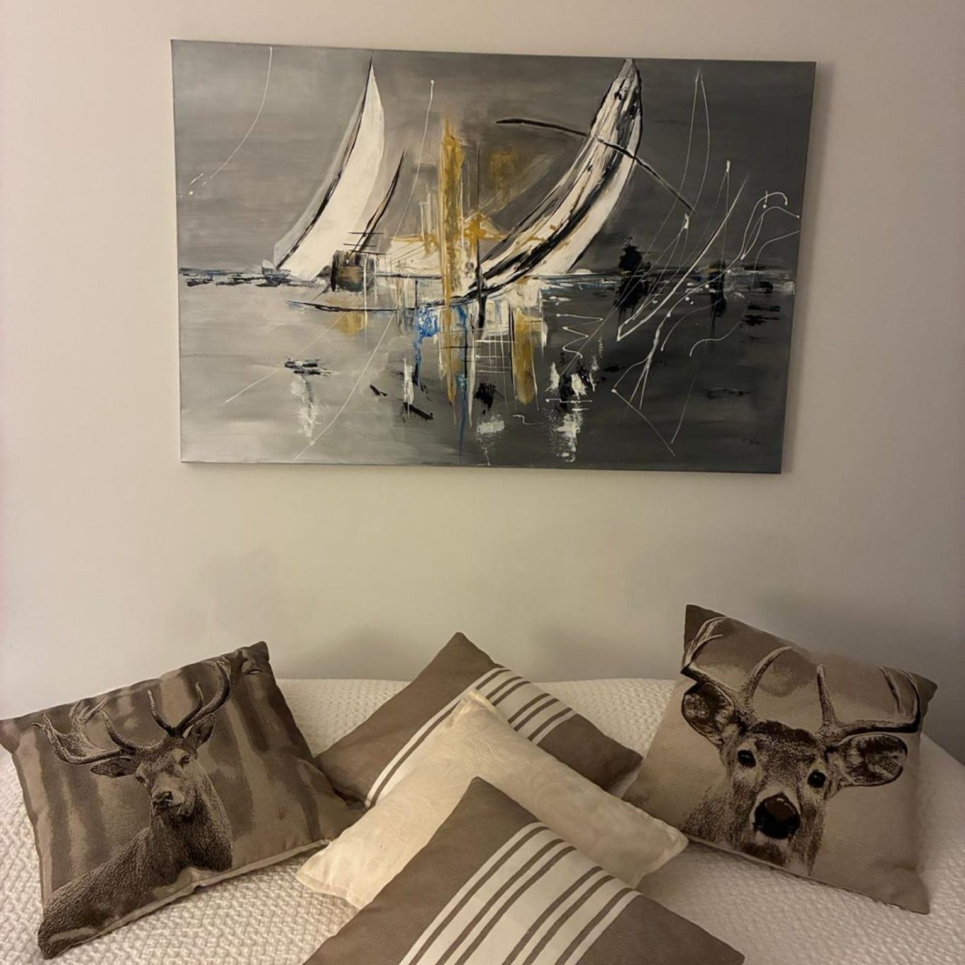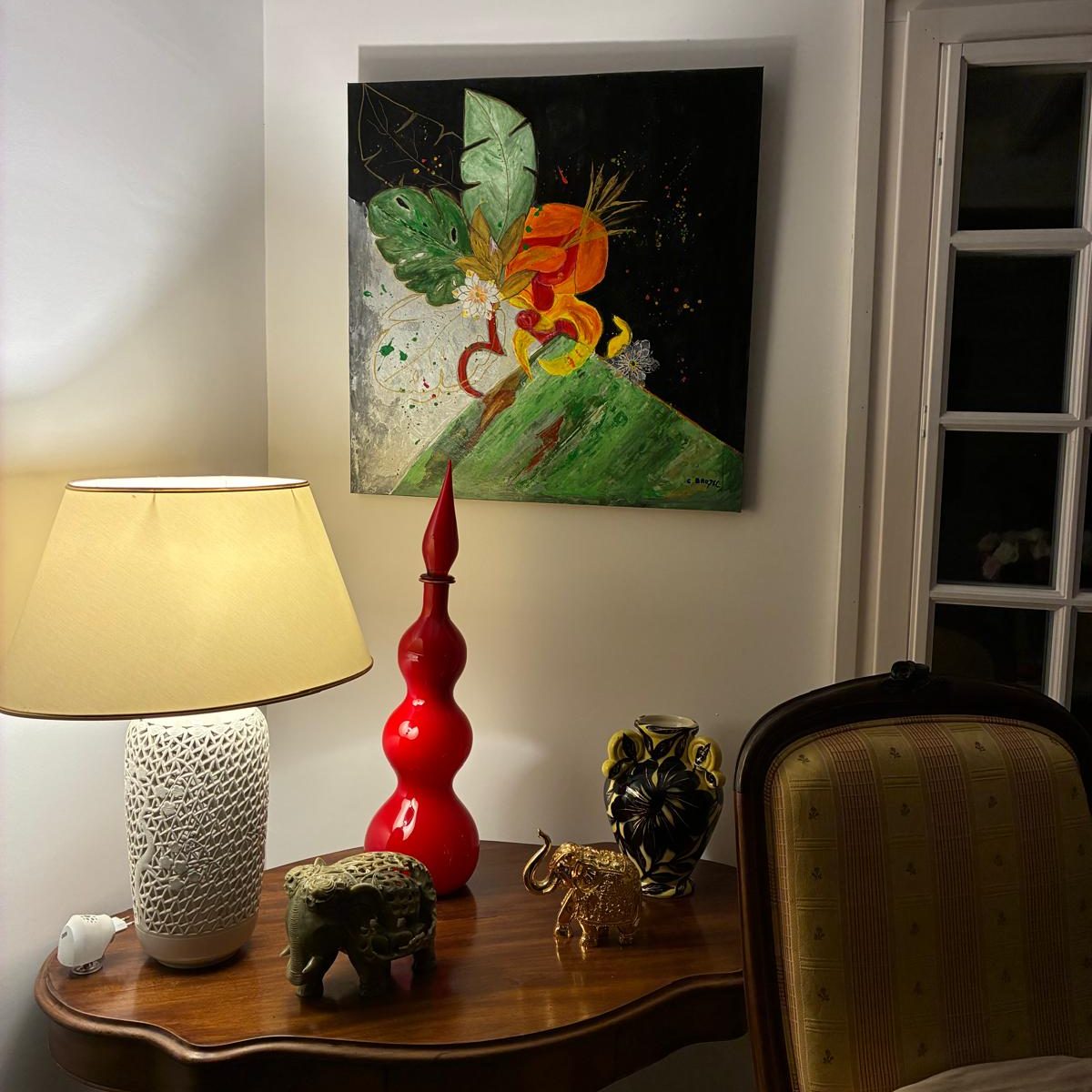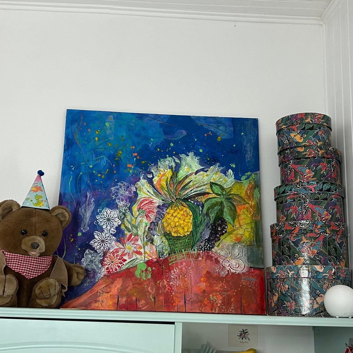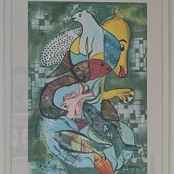 “J'ai été heureusement surprise et ravie de recevoir ce tableau lumineux pour mon anniversaire.Il éclaire par ses bleus subtils mon intérieur plutôt classique qu’il modernise et est la source de nombreuses interpretations de mes amis admiratifs. Merci Geneviève.” Anne P... Touraine